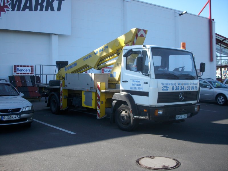 Dieser Mercedes-LKW stand mit seiner Hubbühne vor einem Baumarkt in Bergen/Rügen.