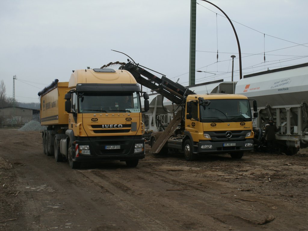 Kiesverladung von Bahn auf LKW,am 16.April 2013,auf dem Bahnhof in Bergen/Rügen.Dabei kamen einer vom mehreren IVECO Kipper zum Einsatz und auch ein Mercedes mit Förderband.