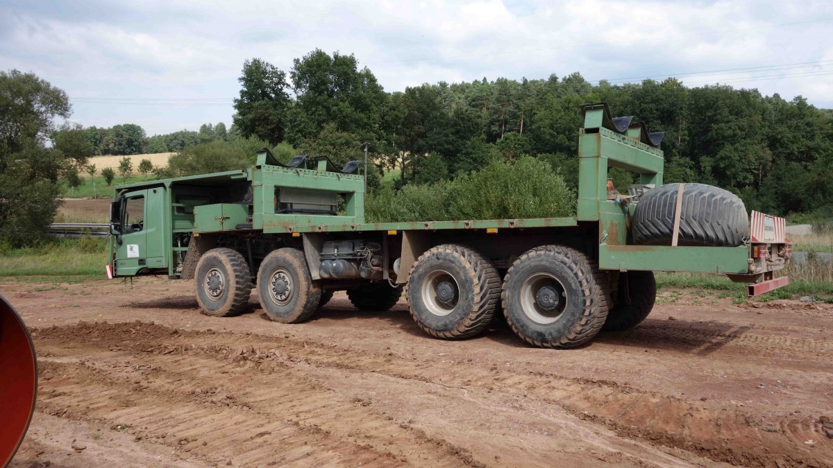 MB Actros 4140 von der Firma "FINKE - Spezialtransporte" nach der Entladung an der MIDAL-Gasleitungstrasse im Bereich von 36100 Petersberg-Steinau, August 2013