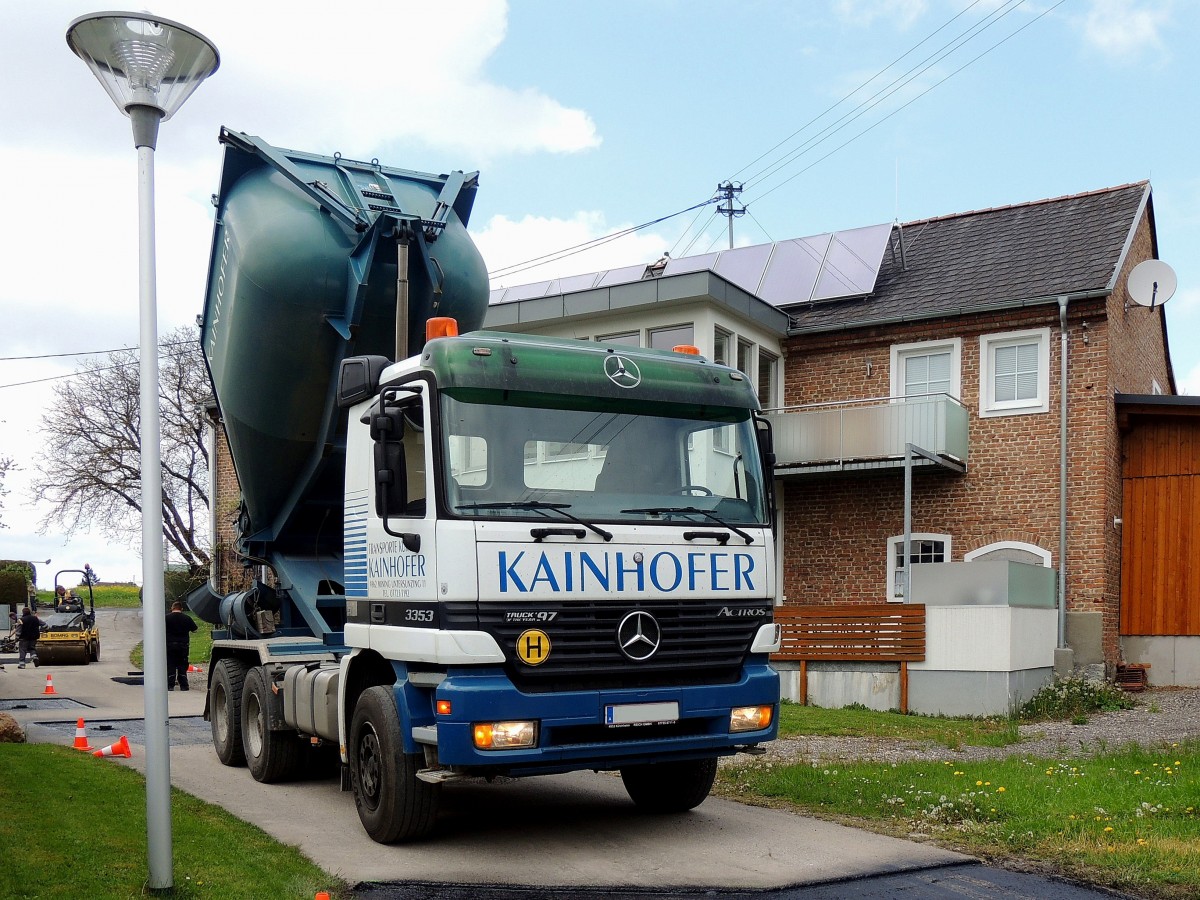 ACTROS-3353, liefert in seiner Asphaltbirne heisses Material zu einer Straßensanierung; 140428