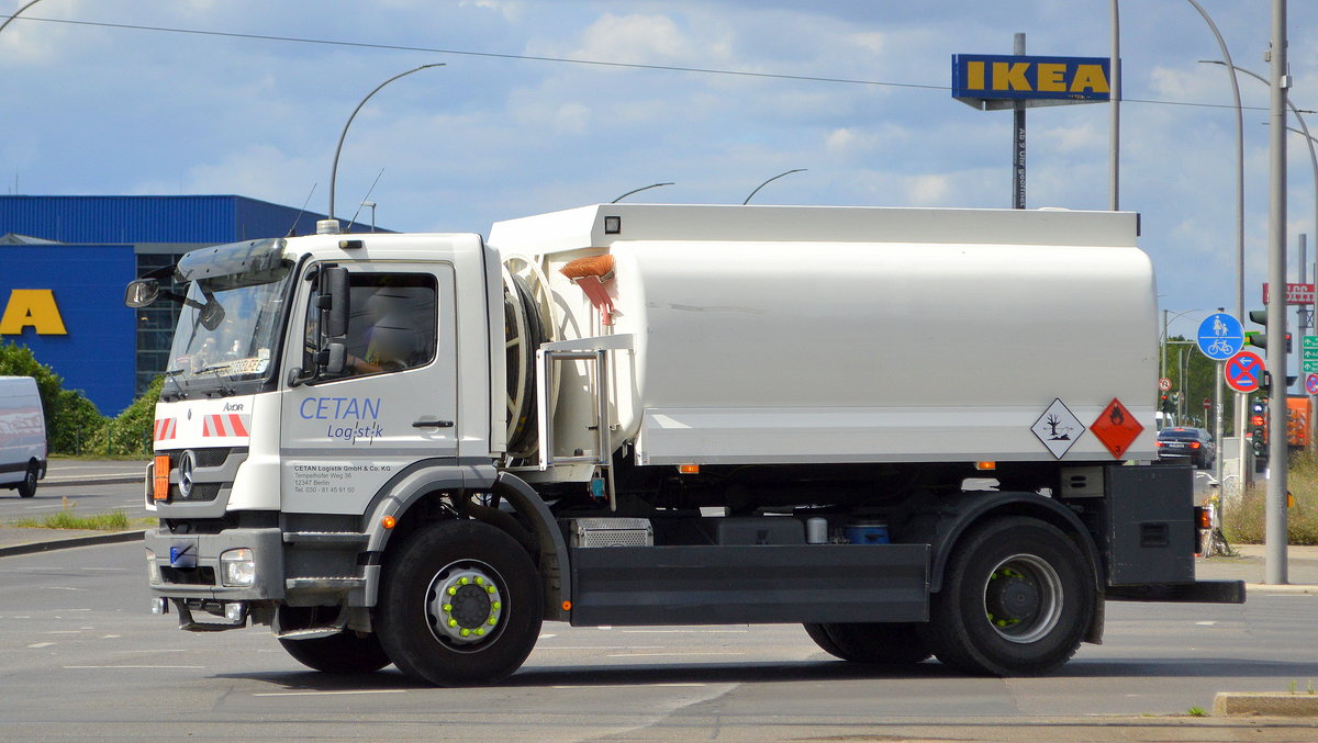 Ein MB AXOR Tanklaaster (UN-Nr.: 30/1202 = Dieselkraftstoff oder Gasöl oder Heizöl (leicht)) der Fa. Cetan Logistik GmbH & Co. KG aus Berlin am 29.07.20 Berlin Marzahn.