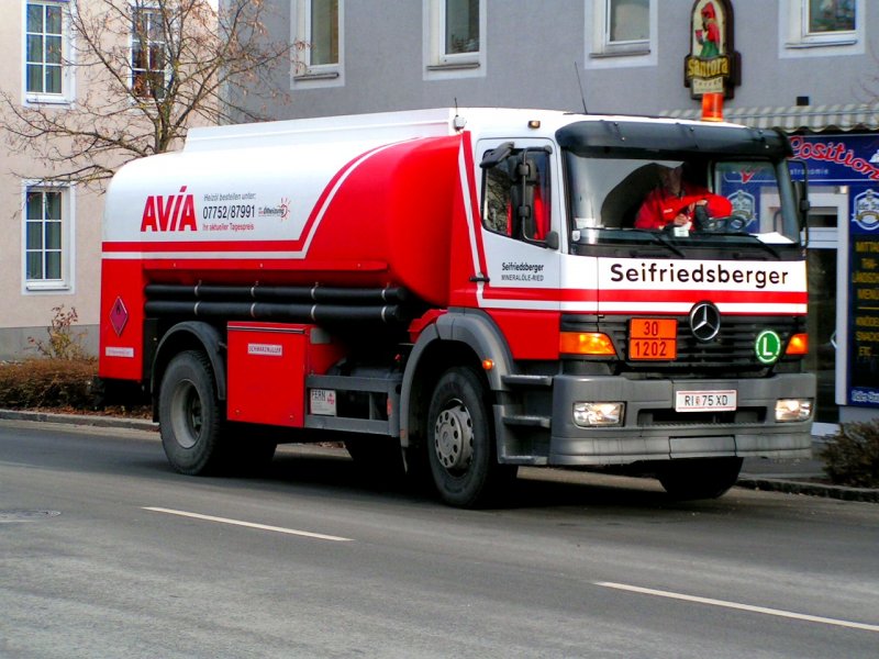 MB mit Tankaufbau quert einen beschrankten Bahnübergang mit Läutwerk; 250318