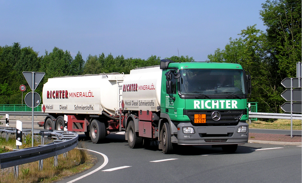 ..Mercedes ACTROS (V8) hier unterwegs als Gefahrgut Hängerzug mit Tankaufbau ( Diesel, Gas- oder Heizöl) nahe der A45 am 30.06.10 -