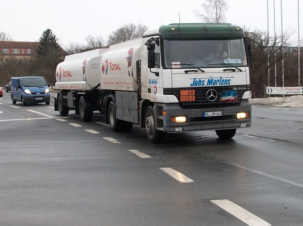 Mercedes-Actros Hängerzug mit Heizöl am 10.Januar 2011 im Stadtgebiet von Bergen/Rügen.