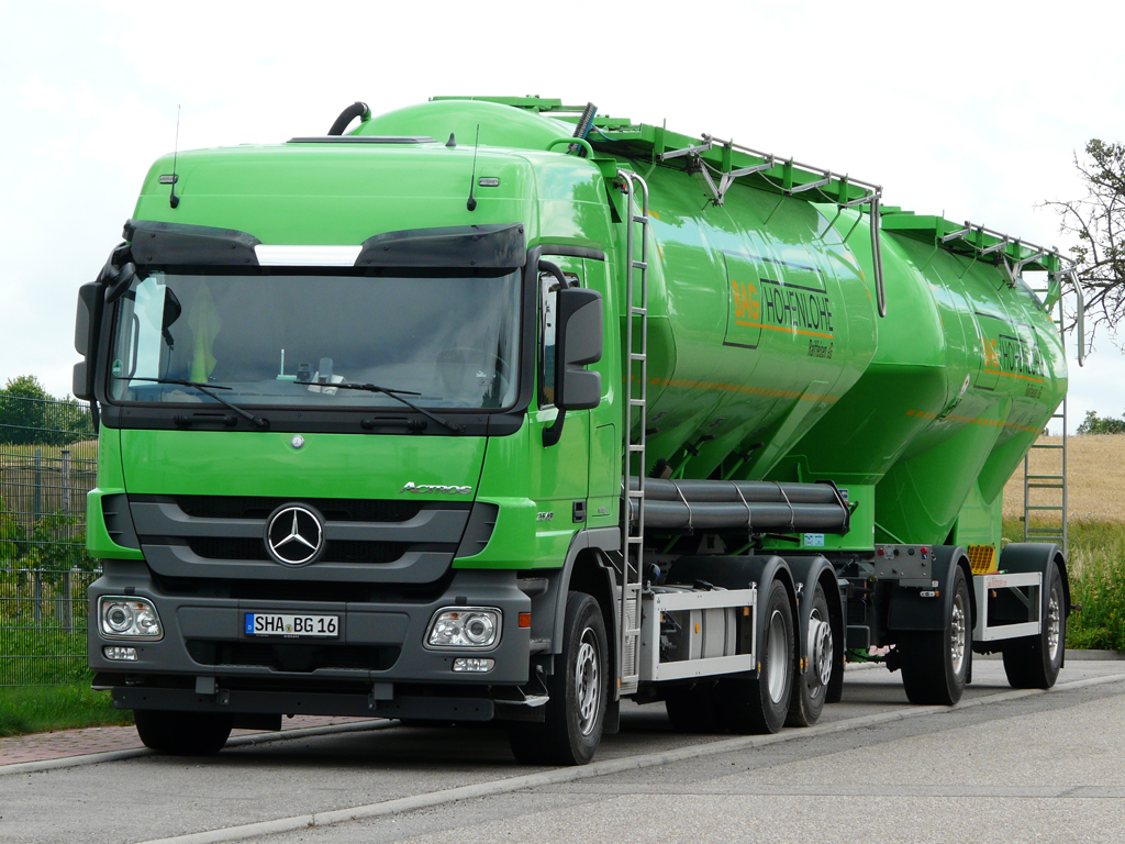 MB Actros MP3 2546 Hängerzug der "BAG Hohenlohe" mit Siloaufbau wartet in einem Industriegebiet in Neuenstein auf den nächsten Einsatz, 15.07.2012