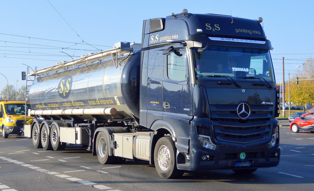 Fa. S&S Schuite & Schuite Druckfarben GmbH mit einem Sattelzug mit Tankauflieger und MB ACTROS 1853 GIGA SPACE Zugmaschine am 14.11.22 Berlin Marzahn.