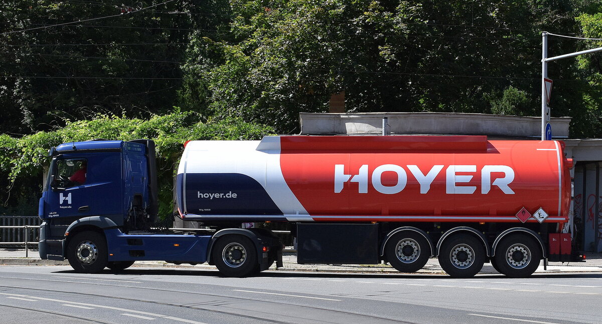 Die HOYER GROUP mit einem Tanksattelzug mit MB ACTROS 1845 Zugmaschine am 08.07.24 Berlin Pankow.