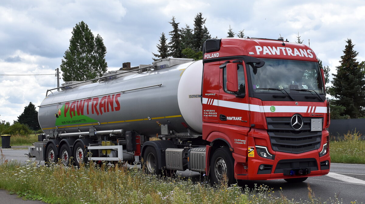 PAWTRANS Holding sp. z o.o. (Polen) mit einem Tanksattelzug für Lebensmitteltransporte mit MB ACTROS L 1848 Zugmaschine am 17.07.24 Bahnübergang Rodleben.