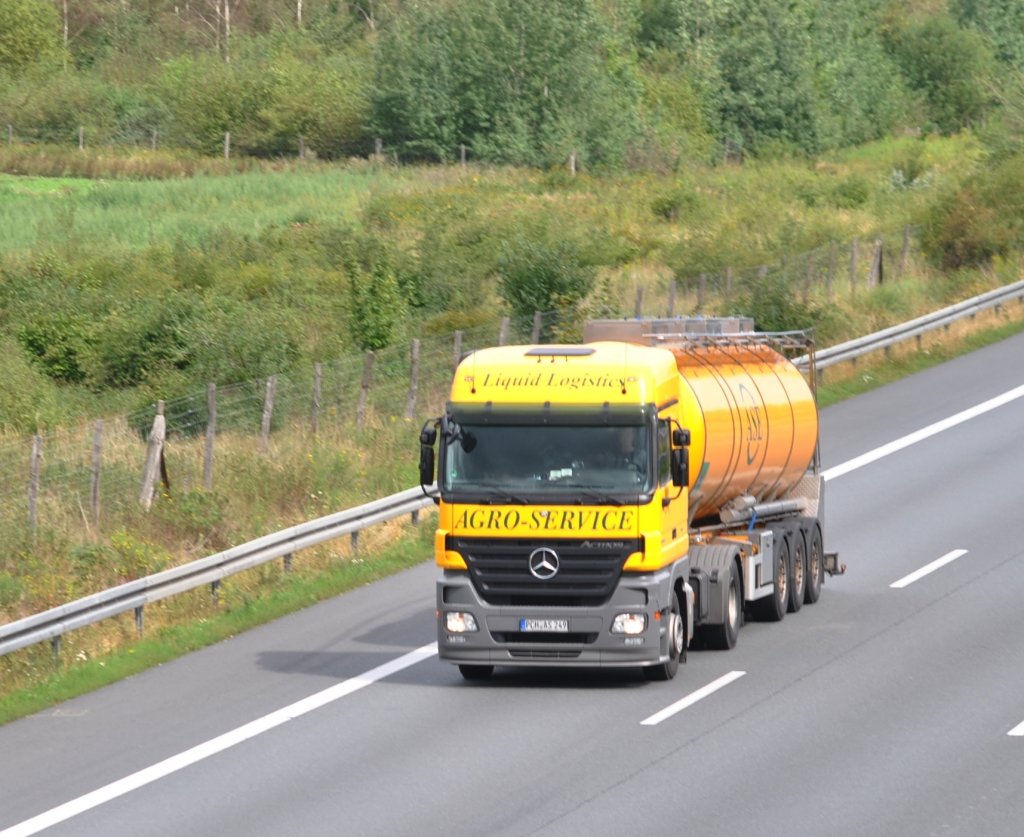 Mercedes Actros Tanksattelzug, auf der A2 bei Lehrte am 16.08.2010.