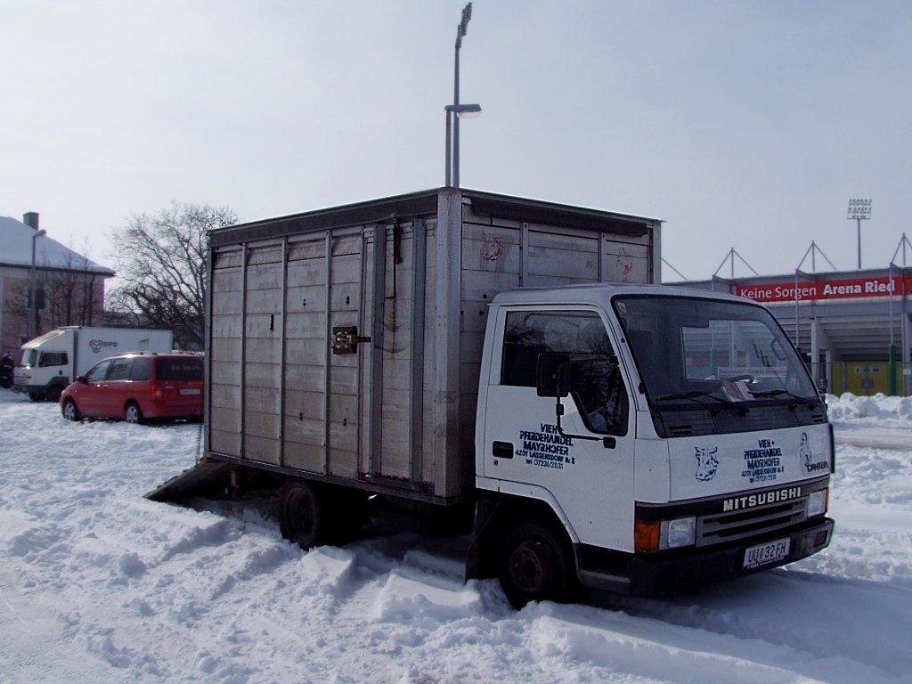 MITSUBISHI mit Viehtransporteraufbau ist am schneebedeckten Parkplatz vor der KeineSorgenArena in Ried i.I. anlässlich eines Pferdemarktes vorgefahren;100217
