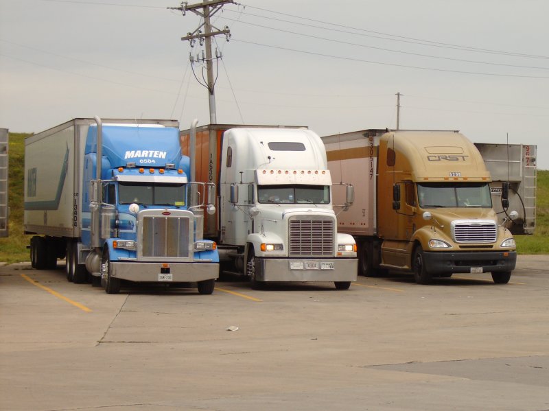Ein Peterbilt und zwei Freightliner stehen auf einem Rastplatz in der Parkposition. (USA, 2005)