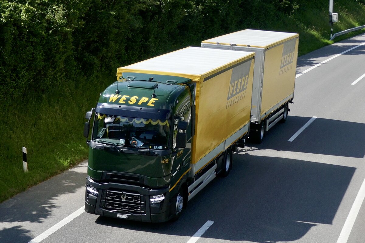Ein Renault Hängerzug von Creabeton am 28.6.24 vor dem Trucker Festival in Bönigen.