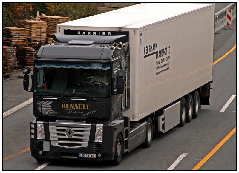 Ein neuer RENAULT MAGNUM "King Comfort" 460PS Euro5 ist mit einem Kühlauflieger bei Lüdenscheid unterwegs. (22.10.2008)