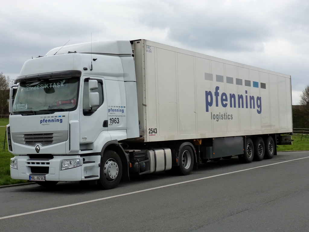 weißer Renault Premium pfennig logistics Kühlkoffer Sattelzug in RE 01042012