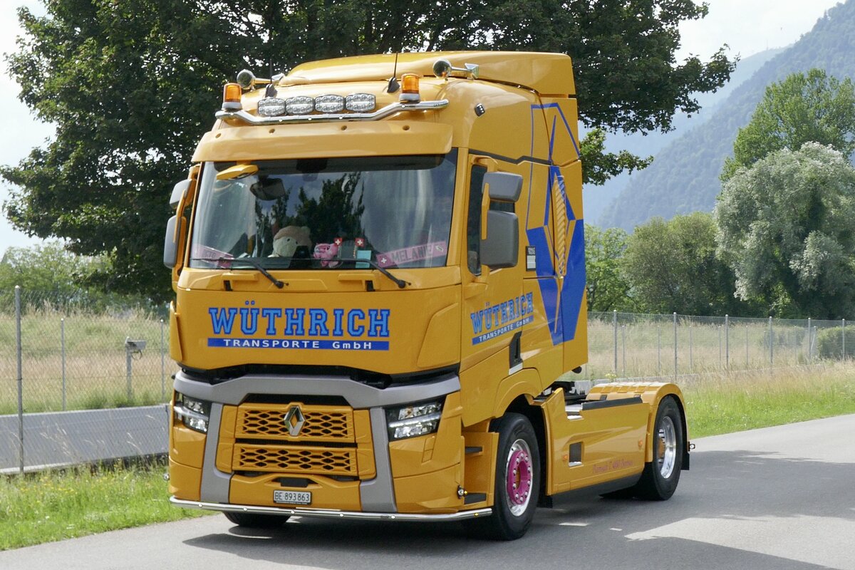 Eine Renault Zugmaschine von Wütrich Transporte die zum Trucker Festival Gelände fährt am 28.6.24 in Bönigen.