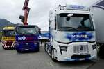 Eine Renault E-Tech Zugmaschine von Thomann Nutzfahrzeuge und Renault von MÜBAG und H.P. Gerber die am 30.6.24 beim Trucker Festival Interlaken stehen.