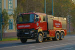 Tanklöschfahrzeug TLF8000 "Víz-1" der Berufsfeuerwehr Gyula auf Renault K-Serie. Das "Vízszállító" (Wassertransport) ist ein ungarisches (Groß-)Tanklöschfahrzeug aus bundeseinheitlicher Katastrophenschutz-Beschaffung aus dem Jahr 2018-2019, aufgebaut werden die Fahrzeuge vom in Ungarn vorherrschenden Aufbauer "Heros".