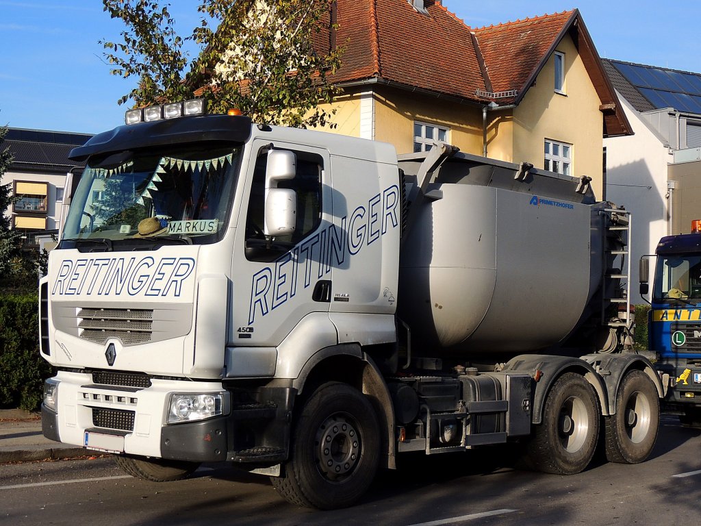 RENAULT-450Premium wartet geduldig den heissen Asphalt aus seiner Thermomulde entladen zu können; 121018