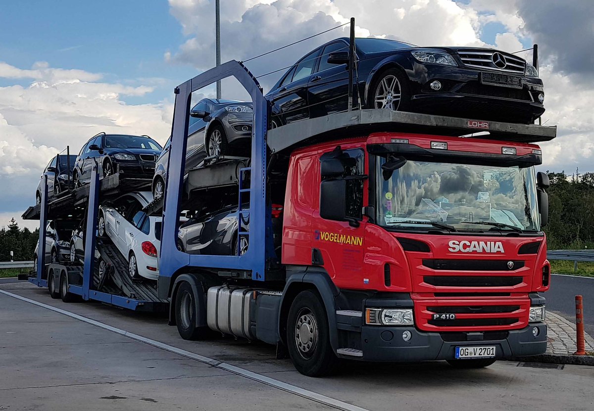 =Scania P410-Autotransporter der Firma VOGELMANN steht auf einem Rastplatz an der A 7, 09-2020