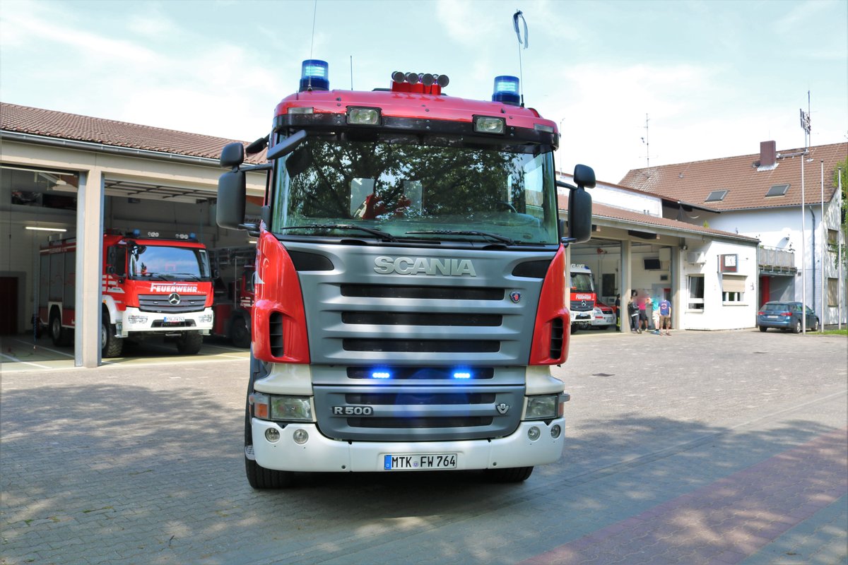 Feuerwehr Hochheim am Main Scania R500 V8 WLF (Florian Hochheim Main 1/67) mit Schnellboot am 22.04.18 bei einen Fototermin