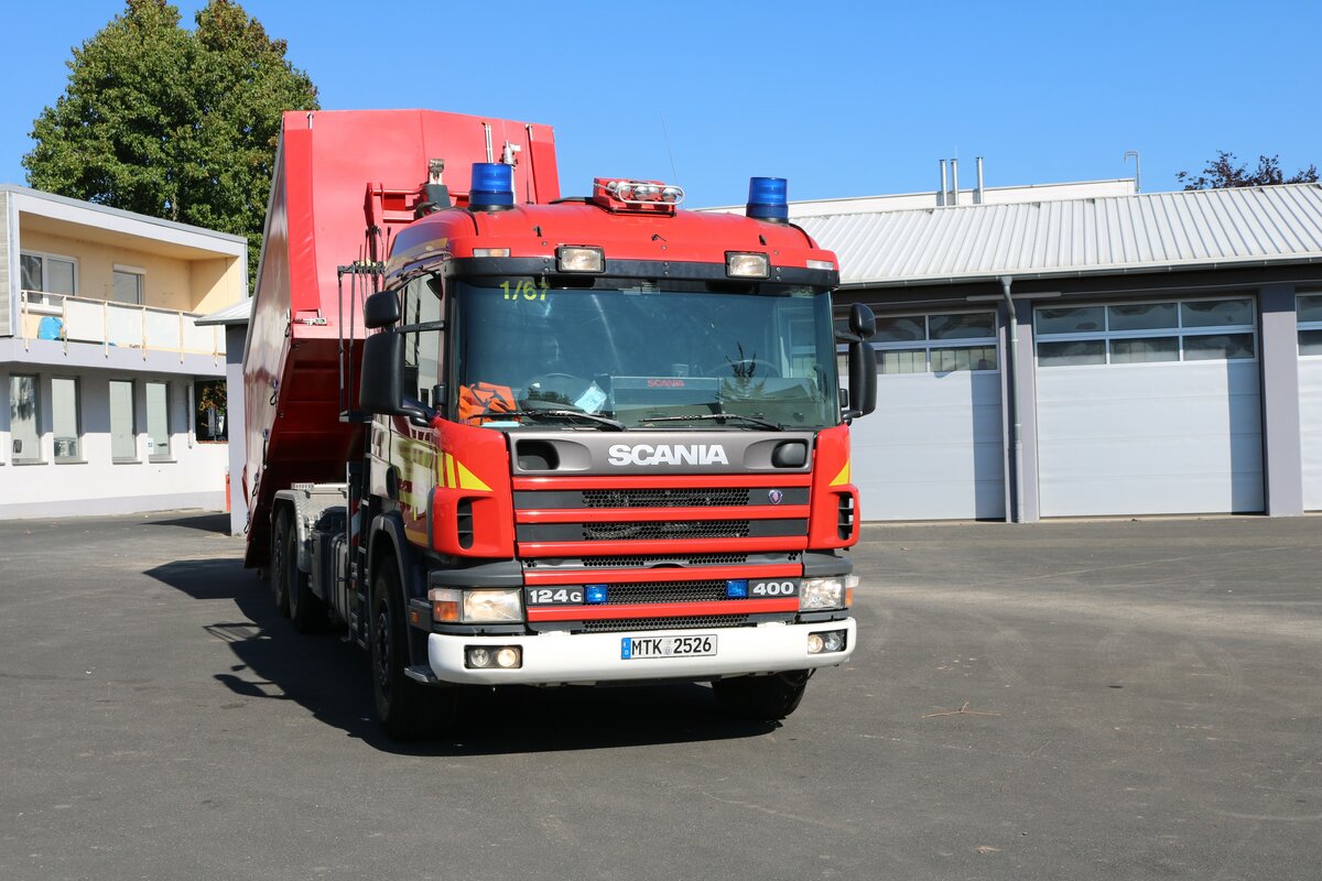 Feuerwehr Hattersheim Scania WLF mit AB Hochwasserschutz am 09.10.21 bei einen Fototermin
