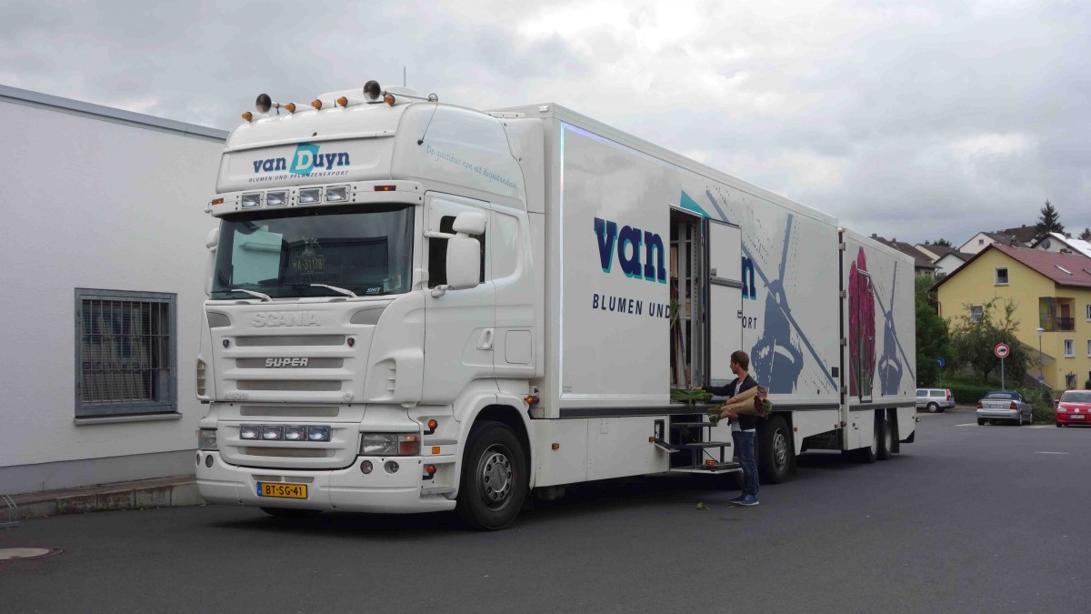 Scania Super als Transportfahrzeug eines Blumenhändlers steht am einem Markt in Burghaun im August 2015