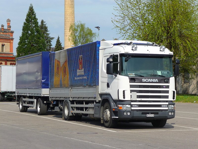 SCANIA 114L 380 AG 213415 mit Anhänger der Brauerei Feldschlösschen im Feldschlösschenareal in Rheinfelden am 18.04.2009