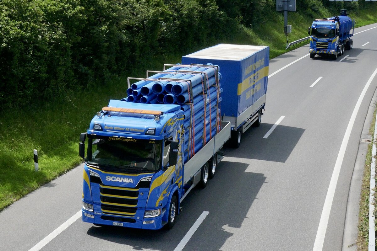 Ein Scania Hängerzug von Martin Wittwer am 28.6.24 unterwegs zum Trucker Festival auf der A8 in Matten b. Interlaken.