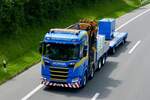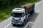 Ein Scania Hängerzug von Martin Wittwer am 28.6.24 auf dem Weg zum Trucker Festival auf der A8 in Matten b. Interlaken.