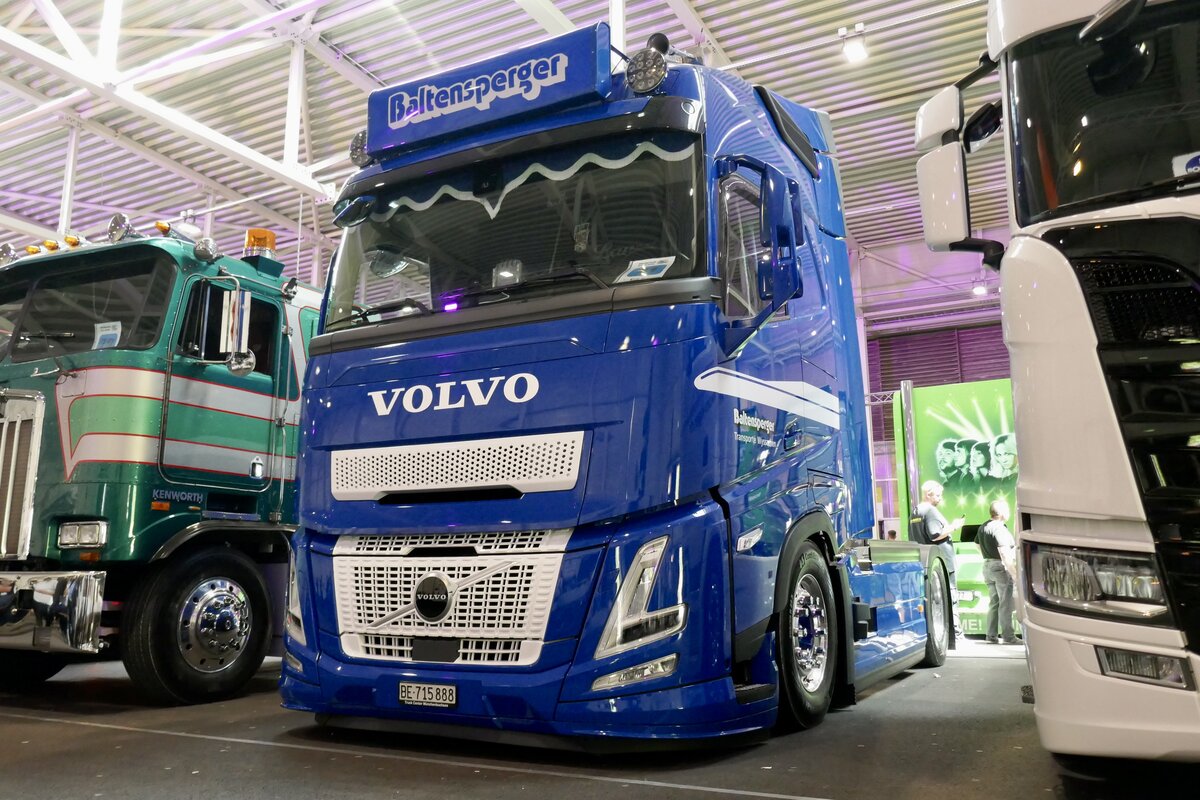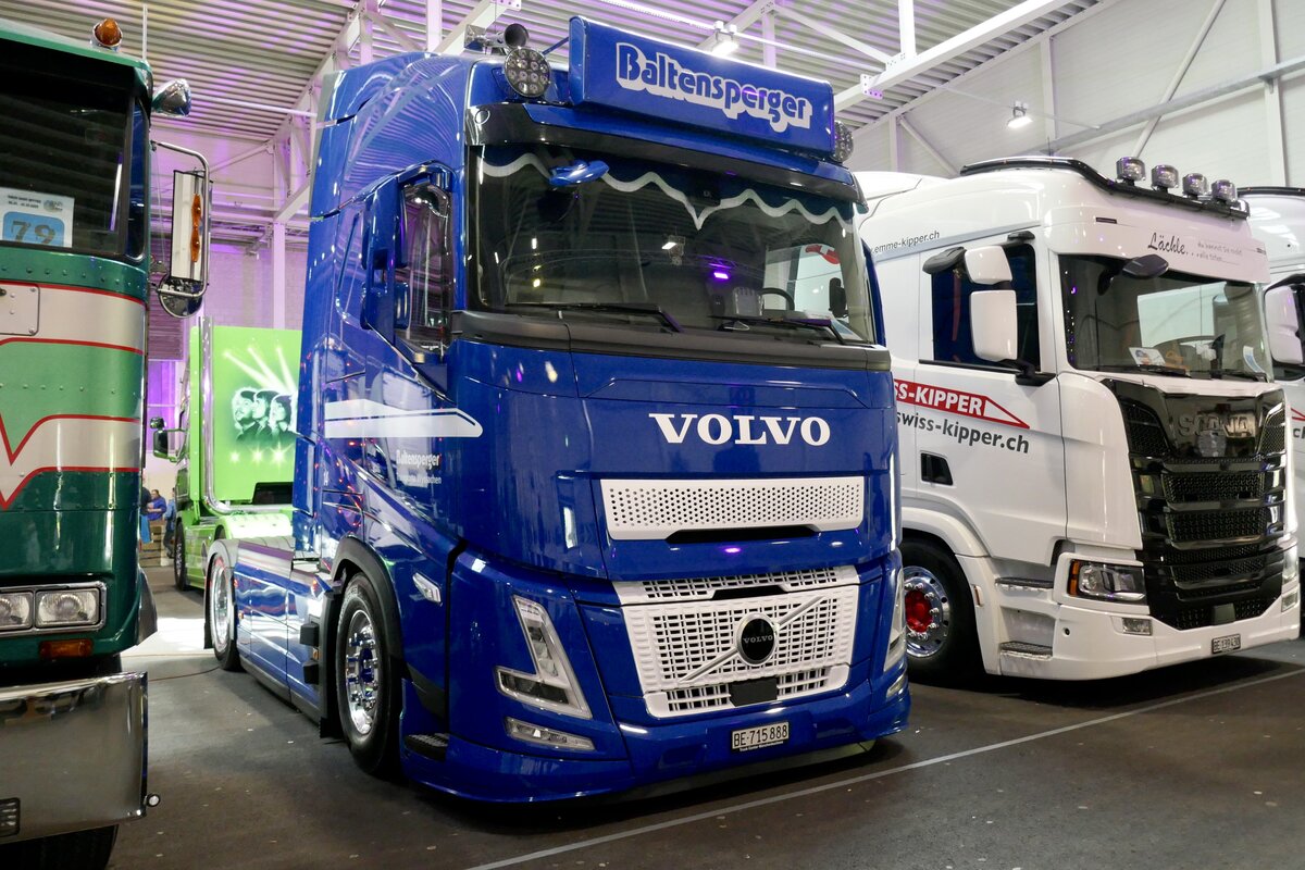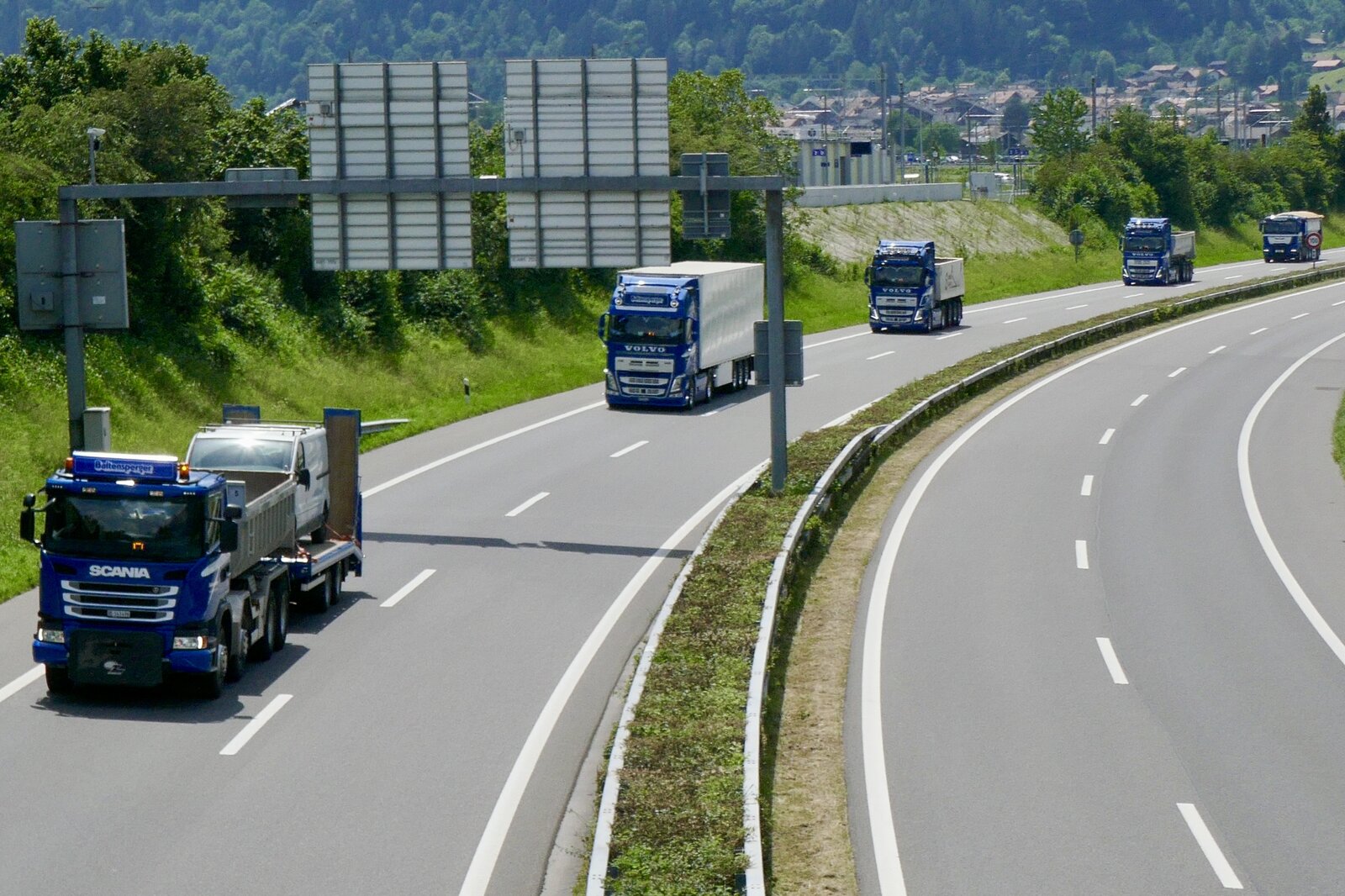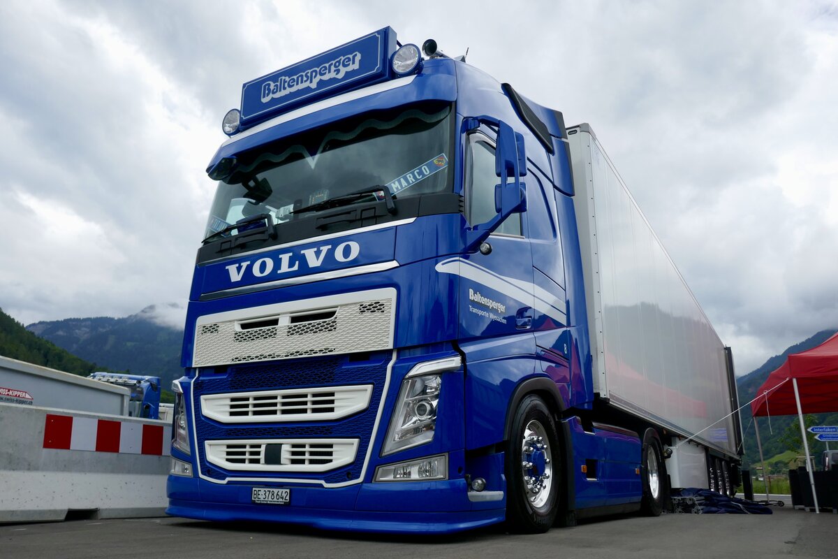 Ein Scania Kipper mit Hänger und weitere LKW von Baltensperger die am 28.6.24 unterwegs ans Trucker Festival sind auf der A8 in Matten b. Interlaken.