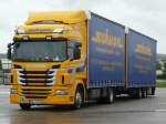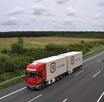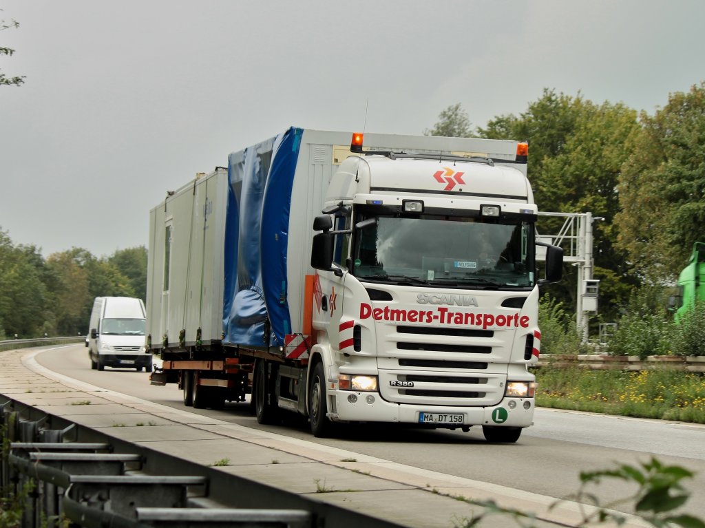 Scania R380 Hängerzug mit überbreiter Ladung (Wohncontainer) am 12.08.2011 auf der A4 kurz hinter der Niederländischen Grenze.