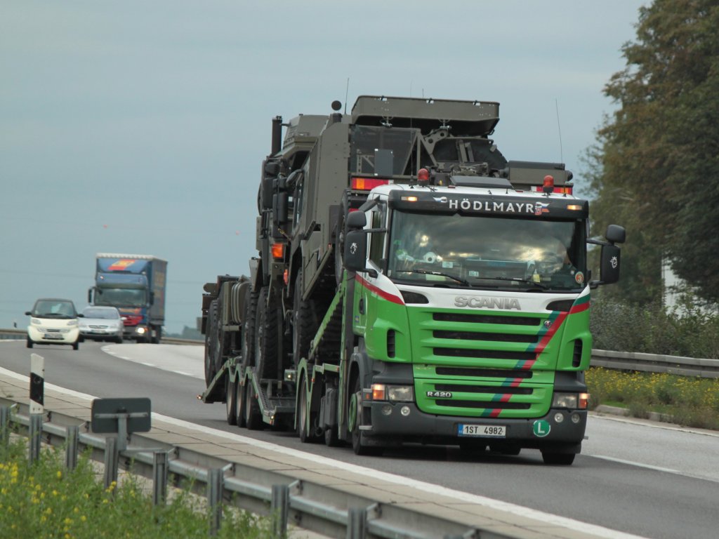 Scania R420 Autotransporter mit zwei Militär MAN Lkw auf den Ladeflächen am 20.09.2011 auf der A4 kurz hinter dem Aachener Kreuz in Richtung Niederlande.