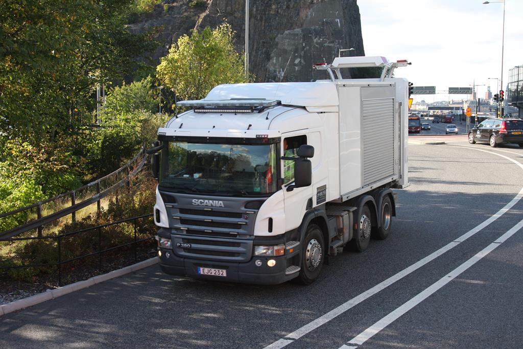 Scania P 380 mit Sonderaufbau am 21.09.2016 in Stockholm in Schweden.