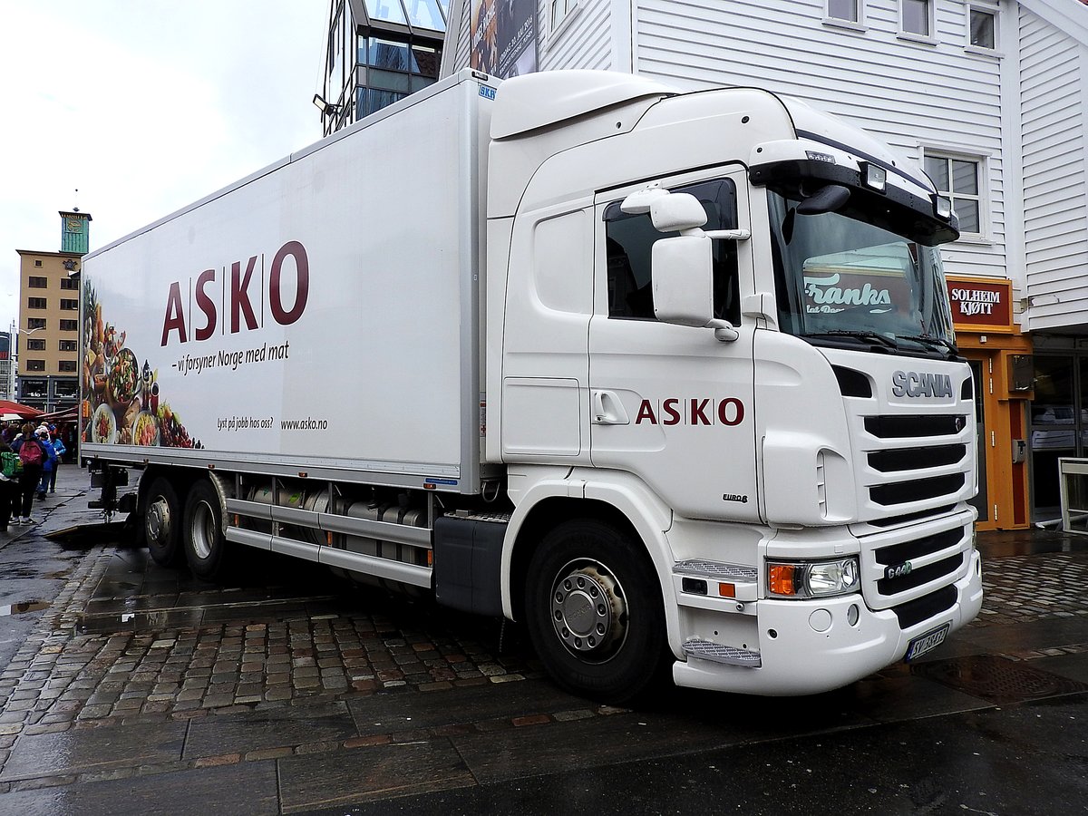 SCANIA G440 bei der Zustellung von Waren in Hafenstadt Bergen; 160718