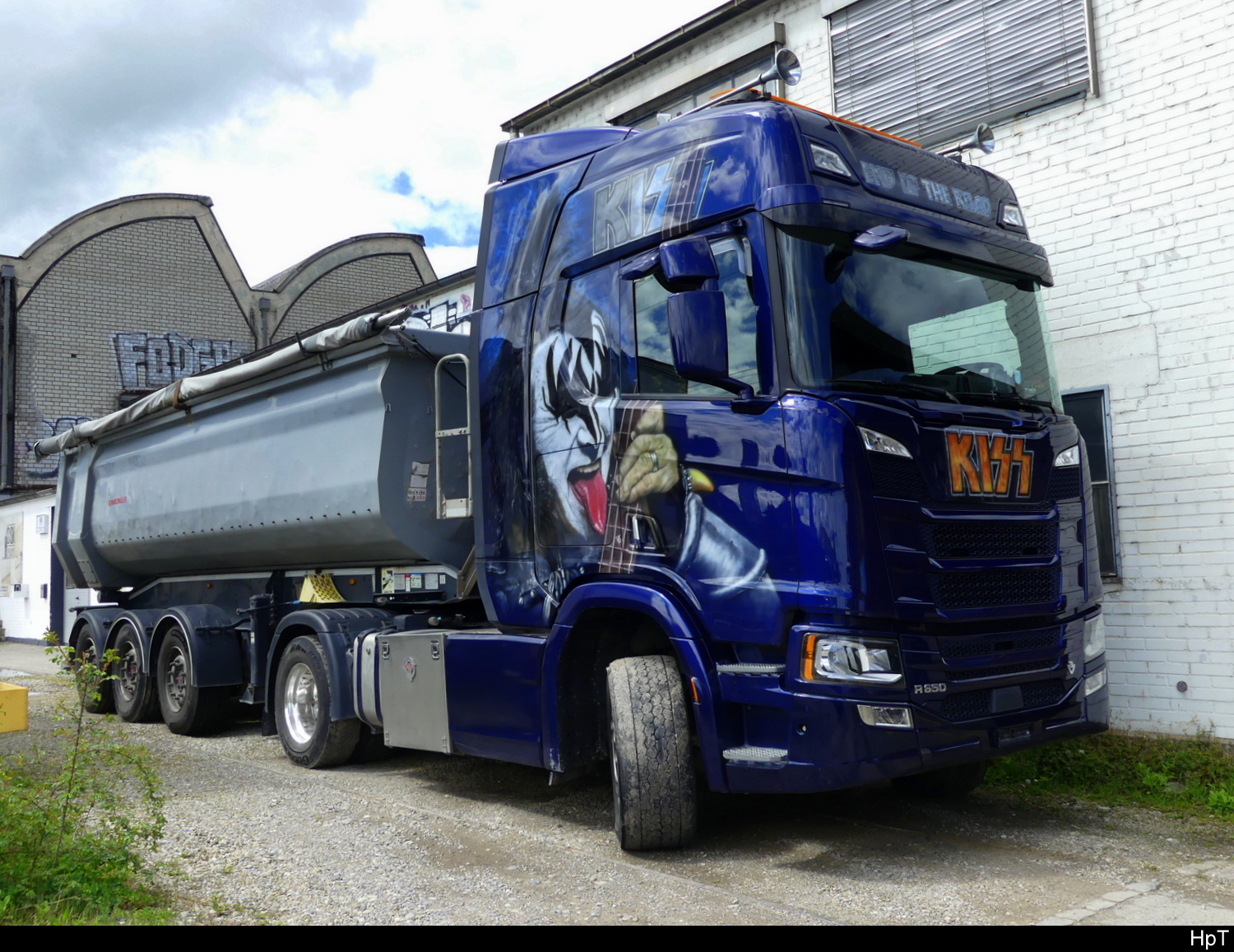 Ein Scania-Kippersattelzug wartet am 2021-04-09 in Bregenz darauf, nicht mehr benötigten Gleisschotter abholen zu dürfen.