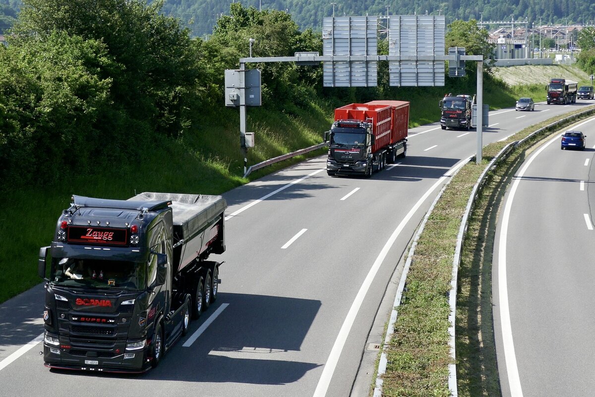 Scania Kippsattelzug und weiter LKW von Zaugg Belp AG auf dem Weg zum Trucker Festival Interlaken am 28.6.24 in Mattem b. Interlaken.