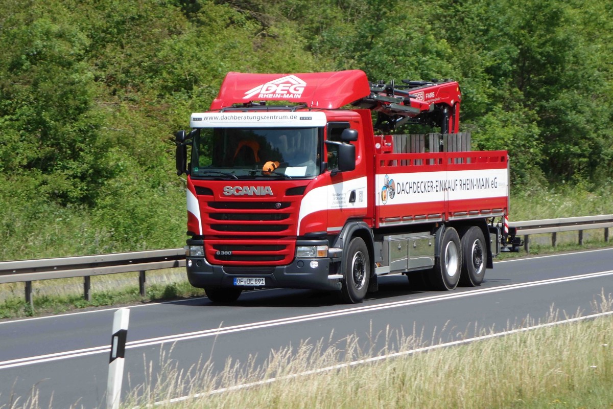 Scania G380 der "DEG", unterwegs auf der B27 im Juni 2015