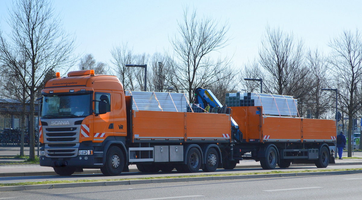 Stranßenunterhaltungsdienst mit einem SCANIA R 490 Pritschen LKW (Selbstlader) + Hänger am 23.03.20 Brandenburg Hbf.