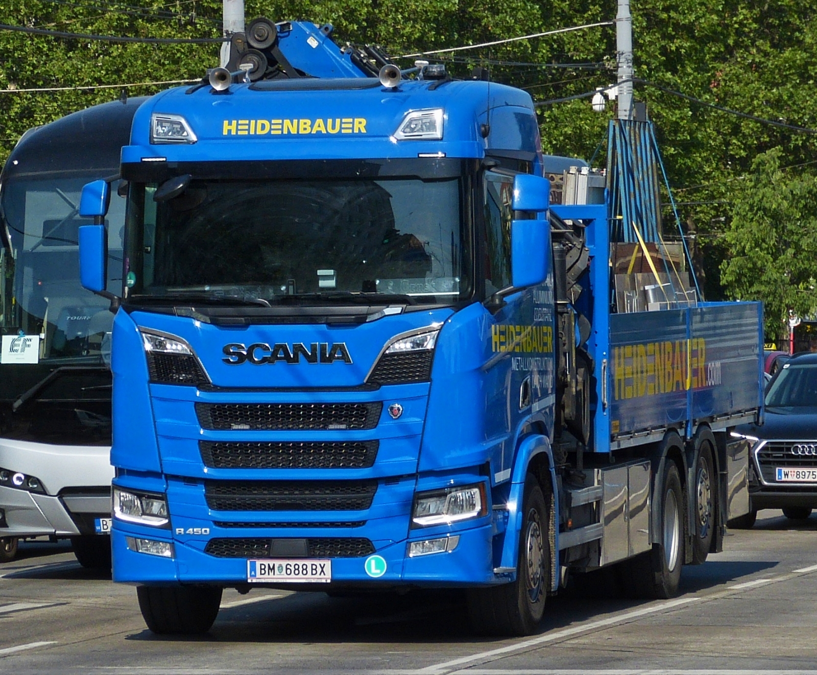 Scania R 450 Pritschenaufbau in den Straßen von Wien gesehen. 06.2023