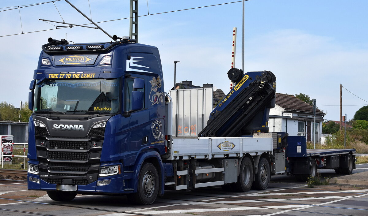Richter Kran und Schwerlast GmbH mit einem SCANIA R 520 Pritschen-LKW (Selbstlader) zum Transport von Baustellencontainern + Hänger am 27.09.23 Höhe Bahnübergang Bahnhof Rodleben.