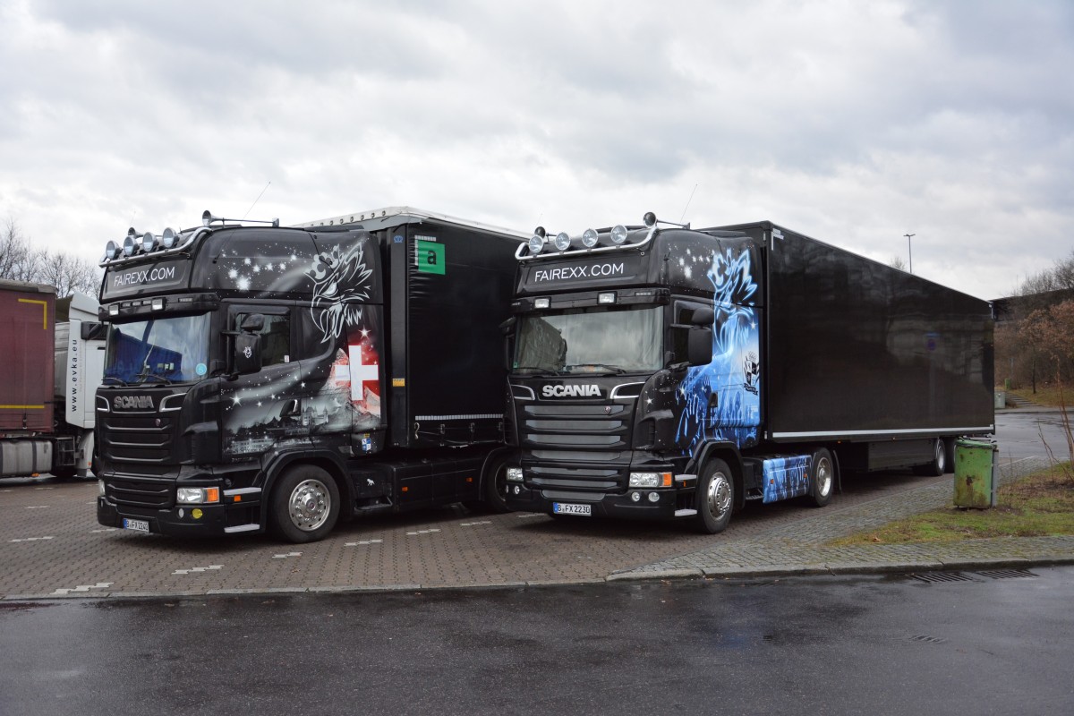 B-FX 2240 + B-FX 2230 (Scania) steht am 10.01.2015 auf dem Rastplatz der Avus in Berlin.