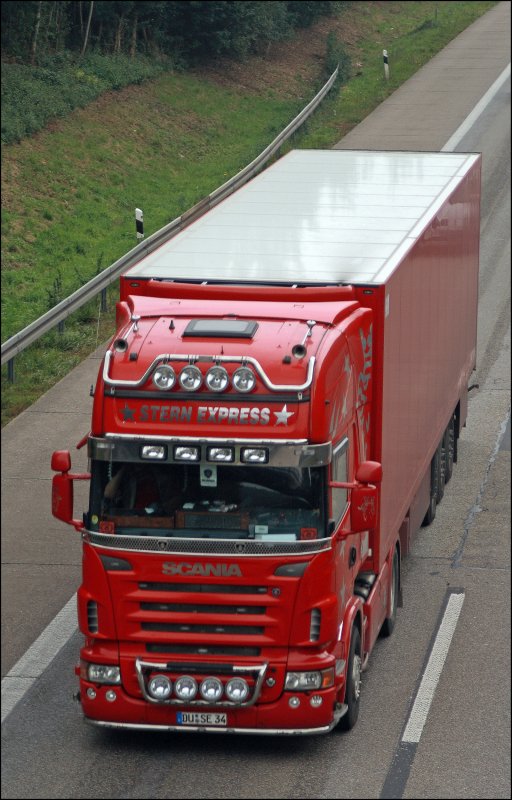 SCANIA \8/ R500 mit Kühlauflieger ist in Richtung Norden unterwegs. Achtzehn Lampen lassen die Straße bei Fernlicht Taghell erscheinen...... (21.09.2008)