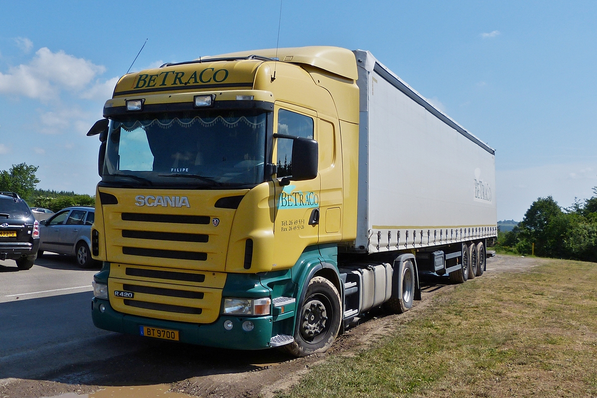 . Scania R 420 Sattelzug wird bei einem Supermarkt entladen. 11.06.2015