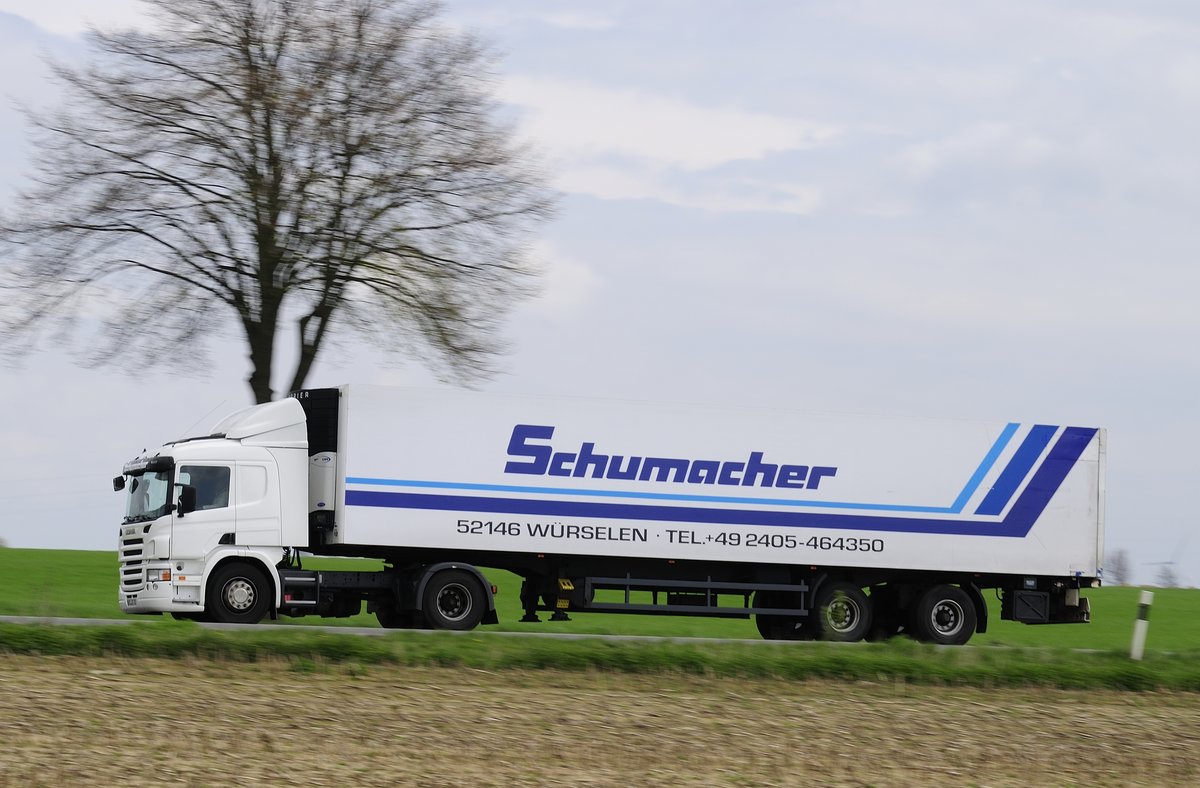 Scania von Schumacher Würselen mit Sattelauflieger, mitgezogen am 10.4.2017 auf der L 164 (ex B221) bei Übach - Palenberg