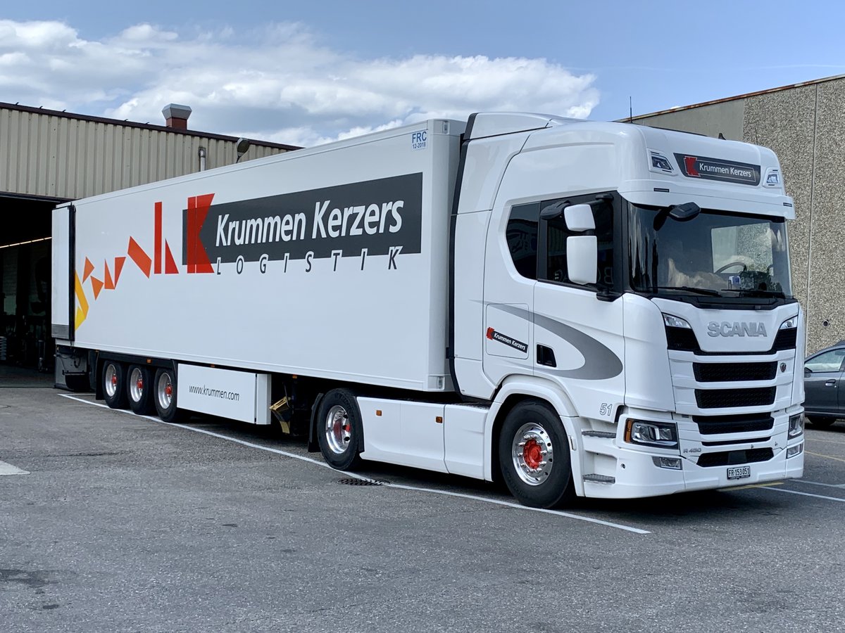 Ein Scania Sattelzug on Krummen Kerzers der am 10.7.20 in Kerzers steht.