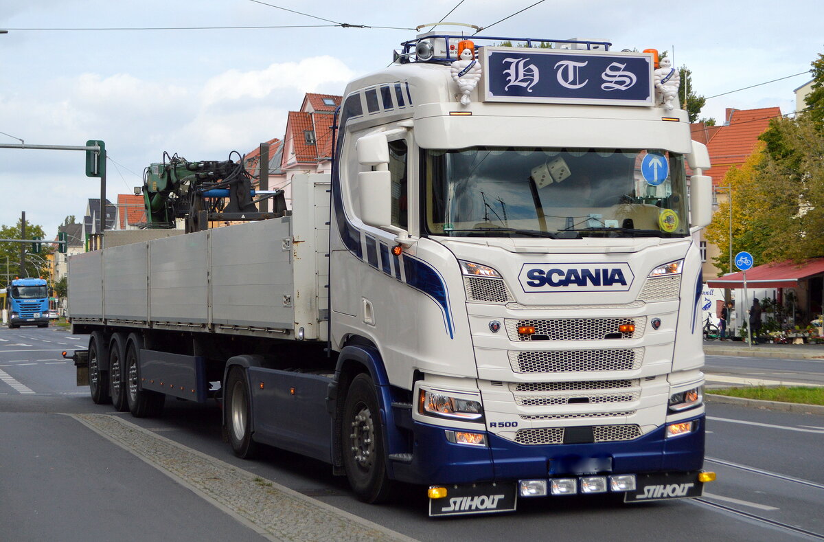 Ein Baustofftransport Sattelzug mit SCANIA R 500 Zugmaschine (ein Selbstlader) am 04.10.22 Berlin Karlshorst.