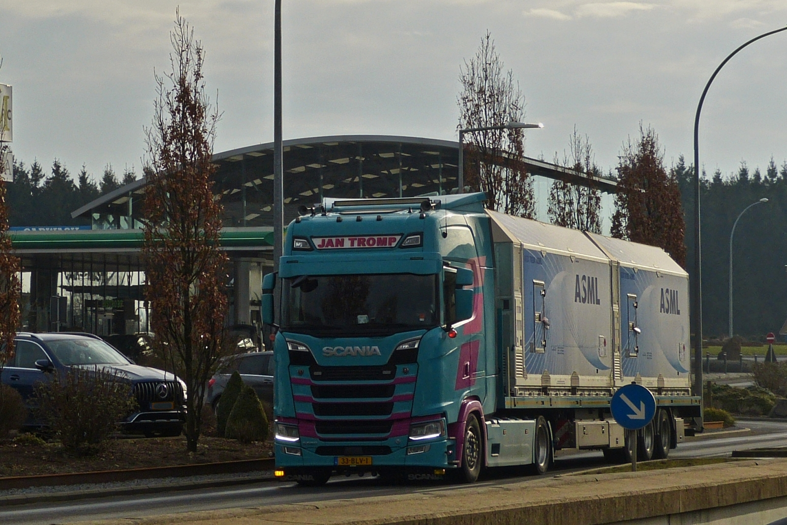 Scania Sattelzug aus den Niederlanden, mit Containern von ASML beladen, gesehen im Norden von Luxemburg. 02.2023