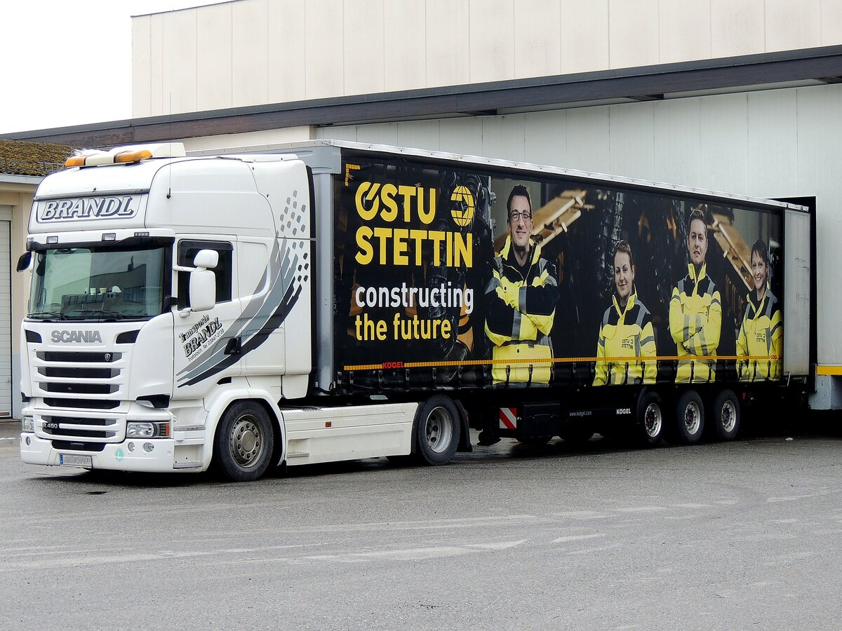 SCANIA R450 von Transporte BRANDL vor einer Laderampe in Ried; 220124