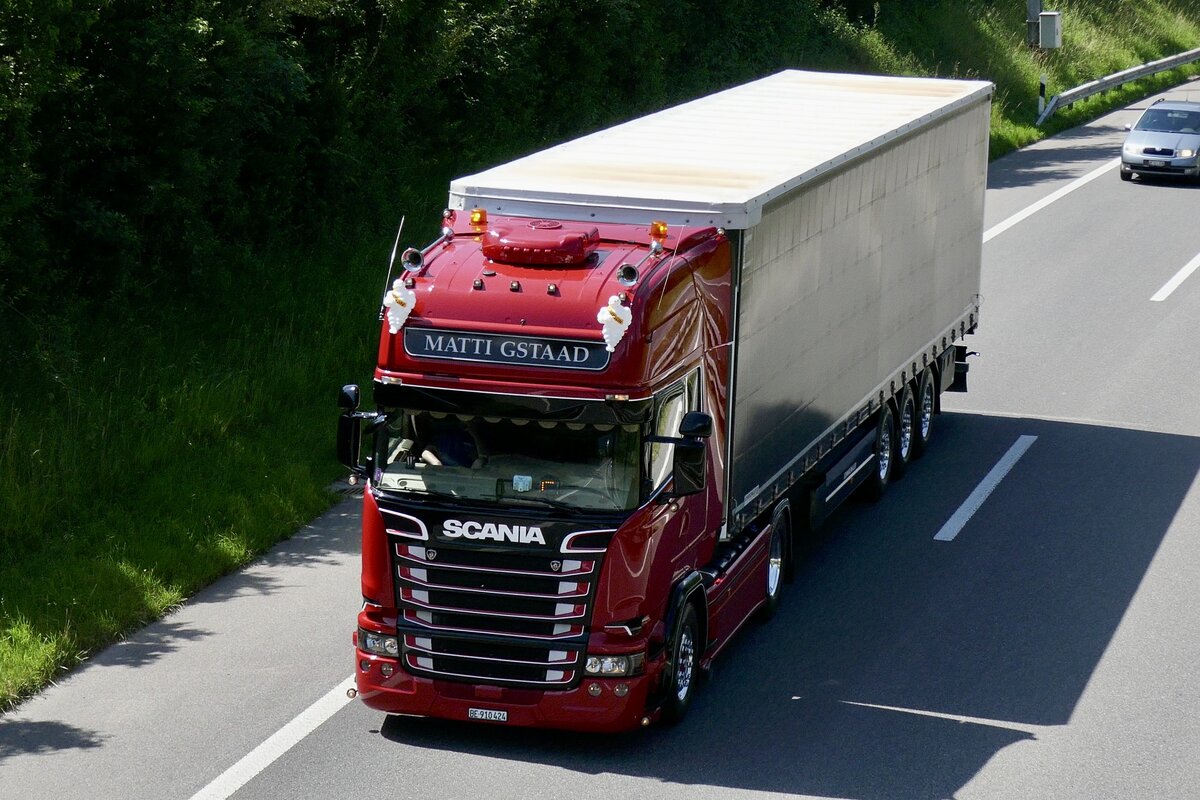 Scania Sattelzug von Matti Gstaad auf dem Weg zum Trucker Festival am 28.6.24 auf der A8 in Matten b. Interlaken.
