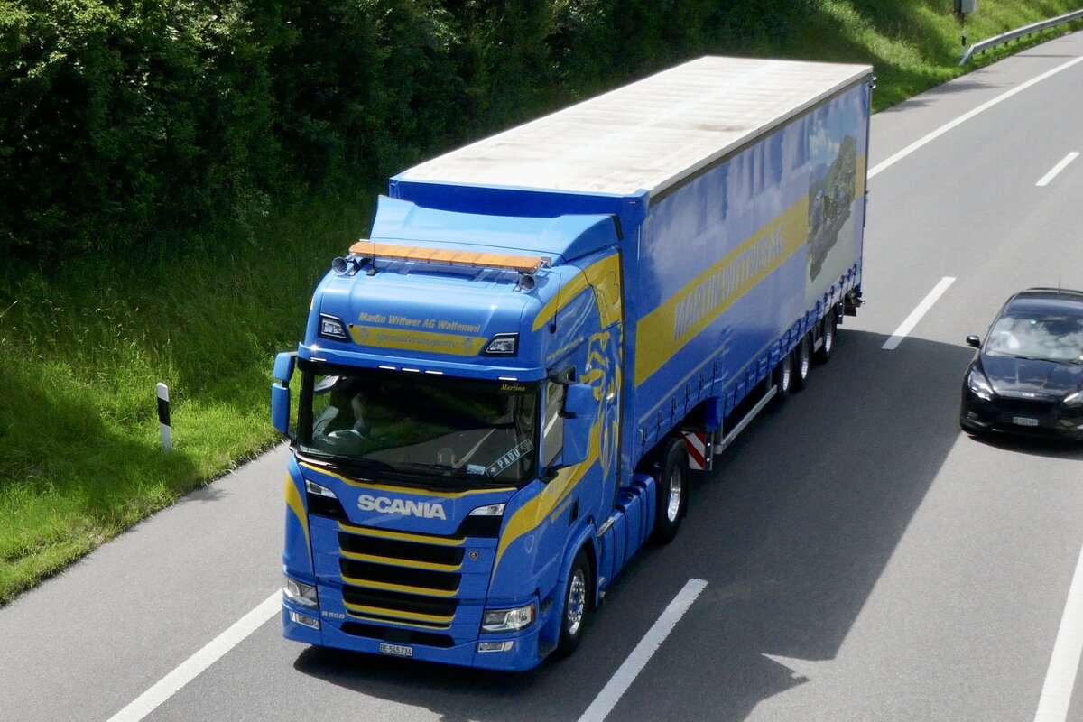 Ein Scania Sattelzug von Martin Wittwer der am 28.6.24 auf dem Weg zum Trucker Festival ist auf der A8 in Matten b. Interlaken.